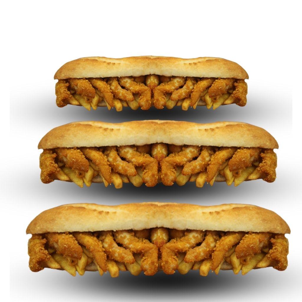 3 Adet taze tam ekmek arasında altın sarısı kızarmış parmak patatesler ve özel baharatlarla kaplanmış çıtır tavuk parçaları İsteğe göre ketçap ve mayonez ile servis edilir.
