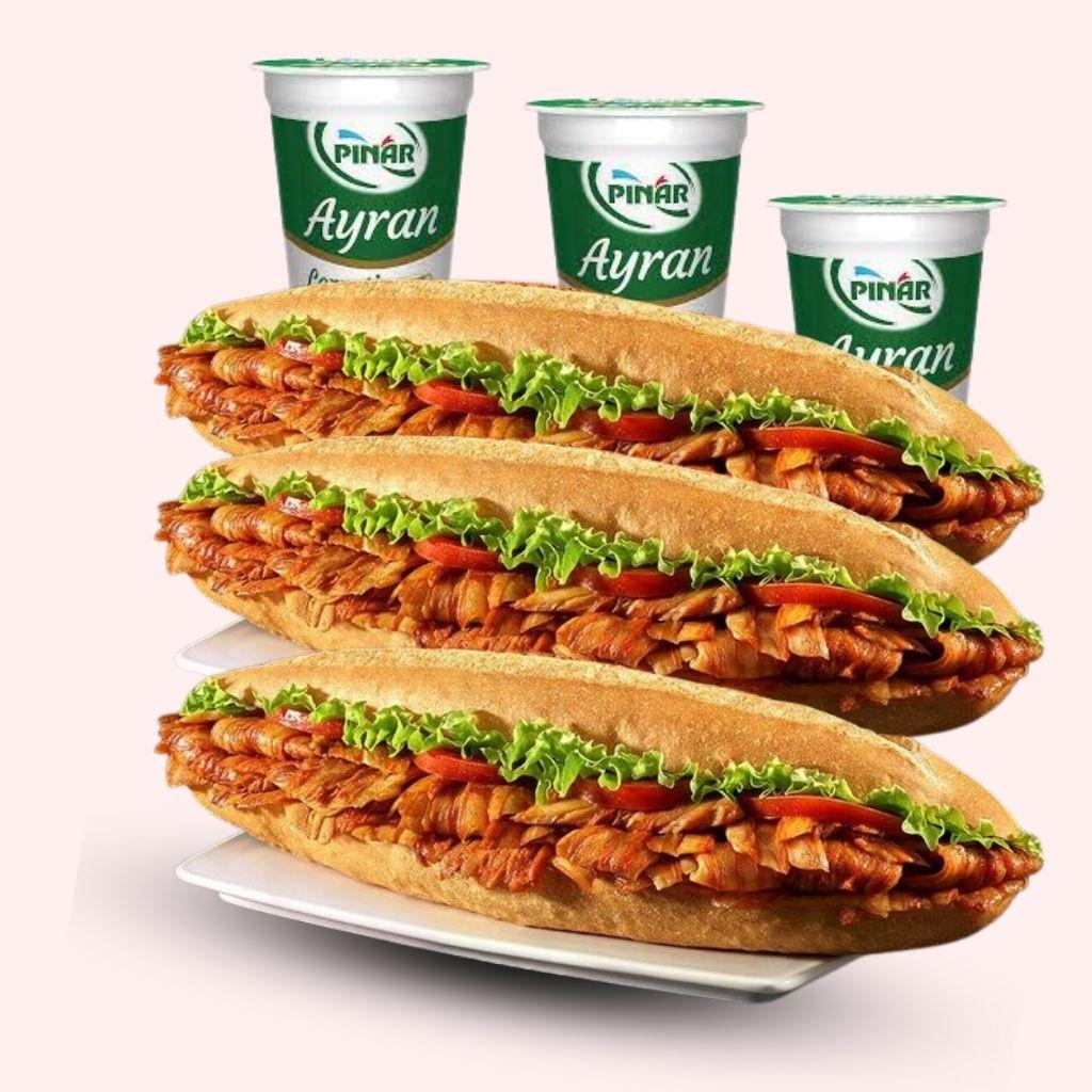 3 Adet Tam Porsiyon Ekmek Arası Döner + 3'lü Ayran Menü