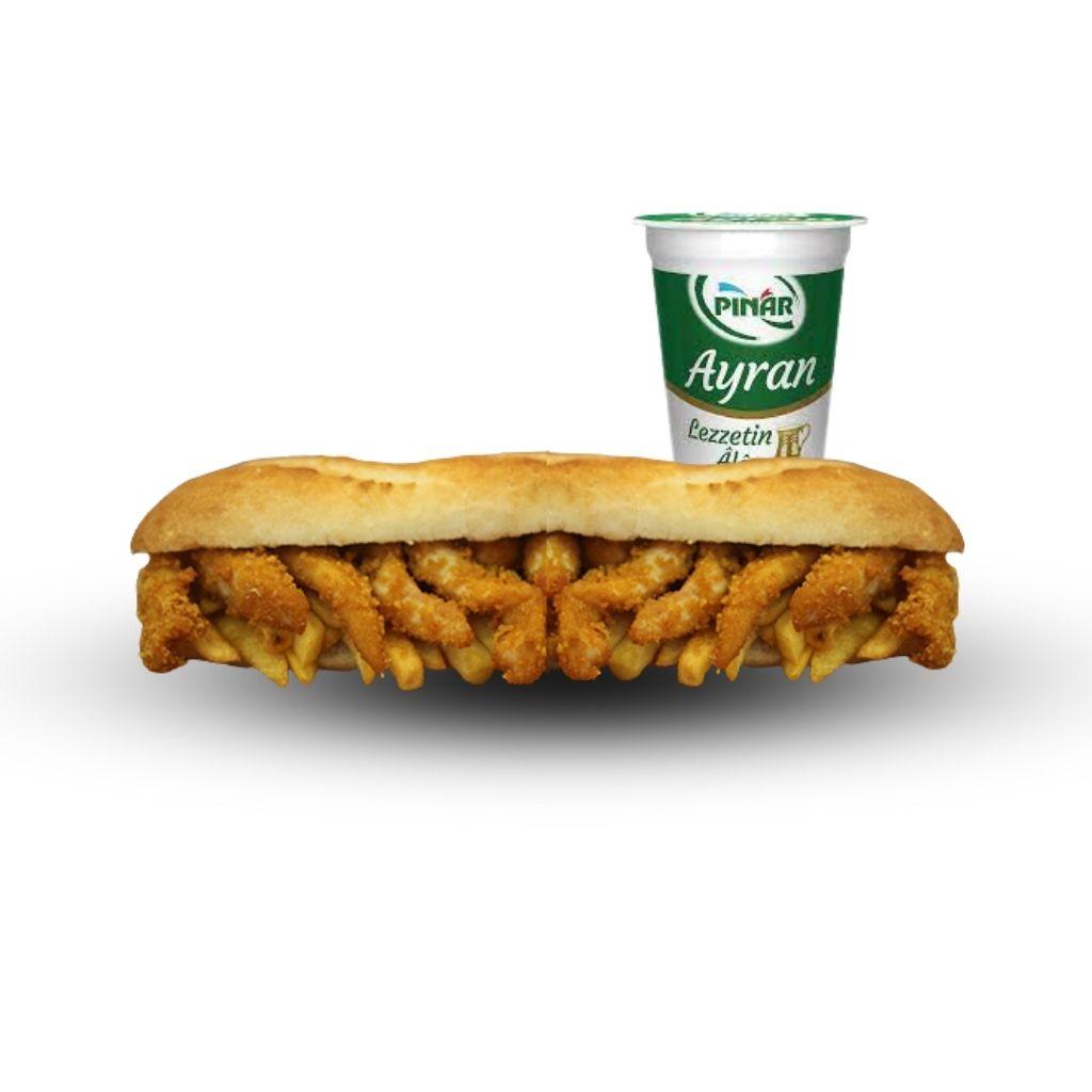 Taze tam ekmek arasında altın sarısı kızarmış parmak patatesler ve özel baharatlarla kaplanmış çıtır tavuk parçaları, ayran ve İsteğe göre ketçap ve mayonez ile servis edilir.